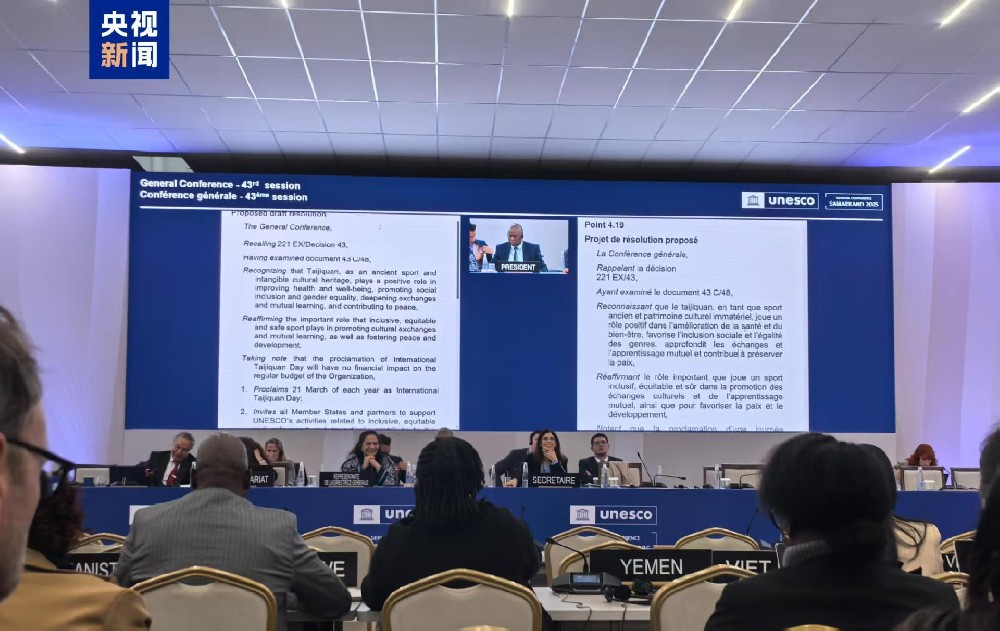 11月5日,正在乌兹别克斯坦撒马尔罕进行的联合国教科文组织大会第43届会议当地时间5日审议通过决议,将每年3月21日(北半球春分日)设立为“国际太极拳日”。这是联合国系统首个以武术项目命名的国际日,标志着太极拳这一中华传统体育瑰宝的重要价值获得全球广泛认可,是全球文明倡议的生动实践。