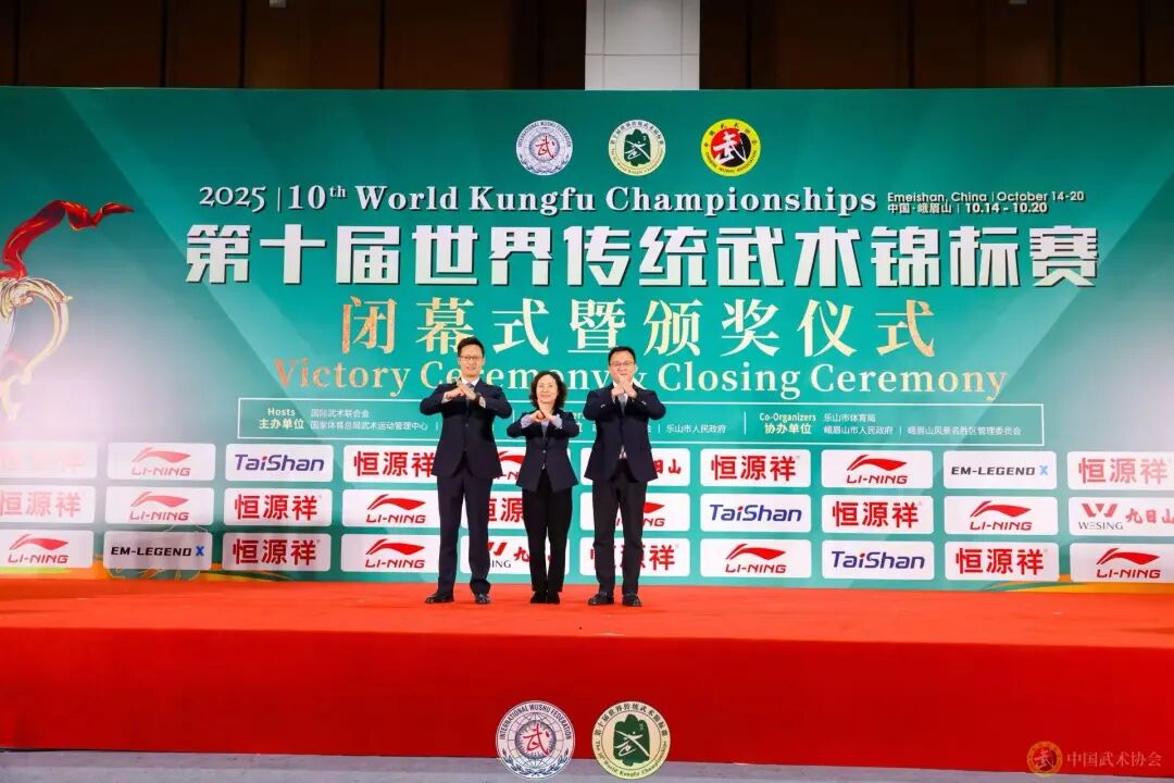 吴廷贵副主席代表国际武联致闭幕辞,谢里夫·穆斯塔法副主席为峨眉山市颁发突出贡献奖。大会还颁发了境外组赛事集体奖、志愿者奖与团队贡献奖。