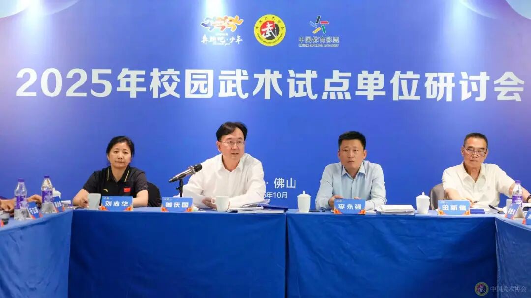 10月14日晚,国家体育总局武术运动管理中心在广东省佛山市组织召开了“2025年校园武术试点单位专题研讨会”。会议由国家体育总局武术运动管理中心青少年活动部主任刘志华主持,国家体育总局青少年活动司副司长姜庆国、国家体育总局武术运动管理中心副主任李永强、广东省武术协会主席田新德、及各相关省市教育、体育部门、武术中心的负责人和新闻媒体同志出席会议。