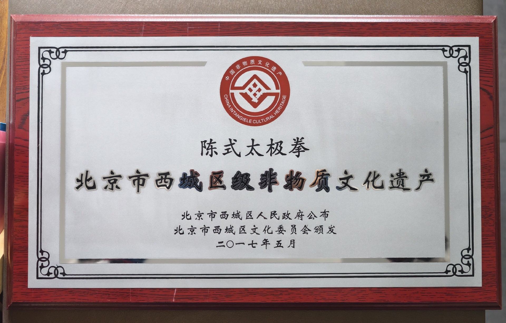 深化申遗工作: 2017年5月,“北京陈式太极拳”被北京市西城区人民政府、北京市西城区文化委员会颁发授予北京西城区区级陈式太极拳非物质文化遗产牌匾。代表性传承人谢志根老师、田秋信老师。